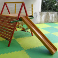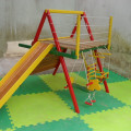 Produzido em madeira de lei. Parafusos com tratamento superficial. Pintura em 3 cores vivas. Cerca e brinquedos com cordas de seda (poliéster) branca.